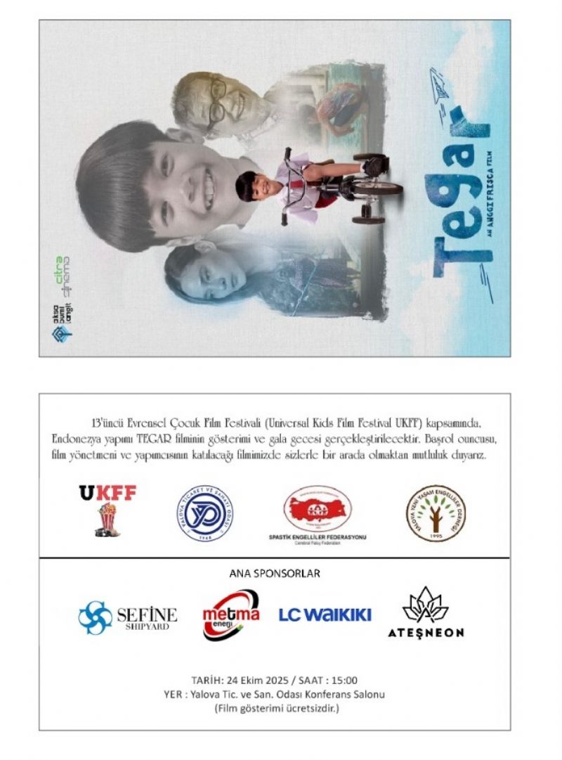 Yalova’da 24 Ekim 2025 Cuma günü, 13. Evrensel Çocuk Film Festivali (UKFF) kapsamında Endonezya yapımı ödüllü “Tegar” filminin gösterimi ve galası gerçekleştirilecek. Yalova Ticaret ve Sanayi Odası Konferans Salonu’nda düzenlenecek film galasında, filmin başrol oyuncusu, yönetmeni ve yapımcısıyla birlikte birçok uluslararası sinema emekçisi de konuk olacak.