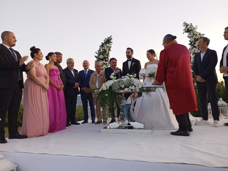 Nikah kıyılacak platforma golf arabasıyla gelen çiçeği burnunda gelin Işılay Merve Güzbey ve damat Uğurcan Küçükbingöl'ün nikahını Seferihisar Belediyesi nikah memuru İbrahim Alkan gerçekleştirdi.